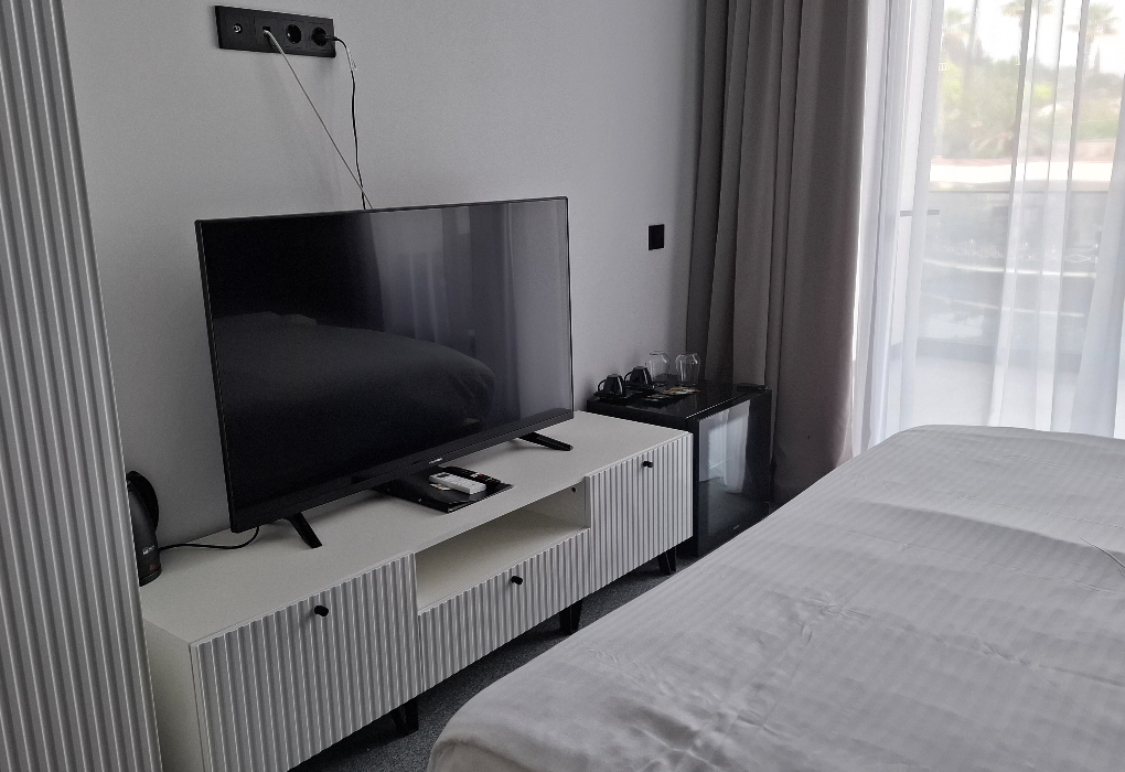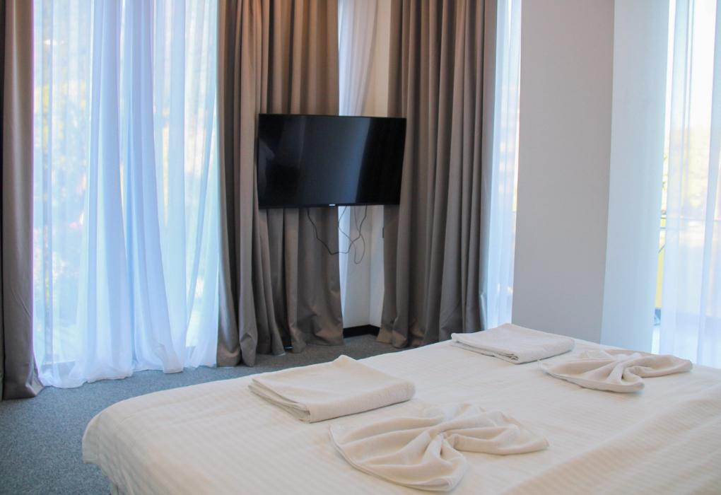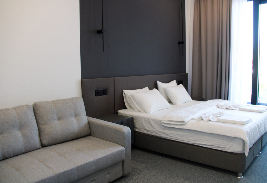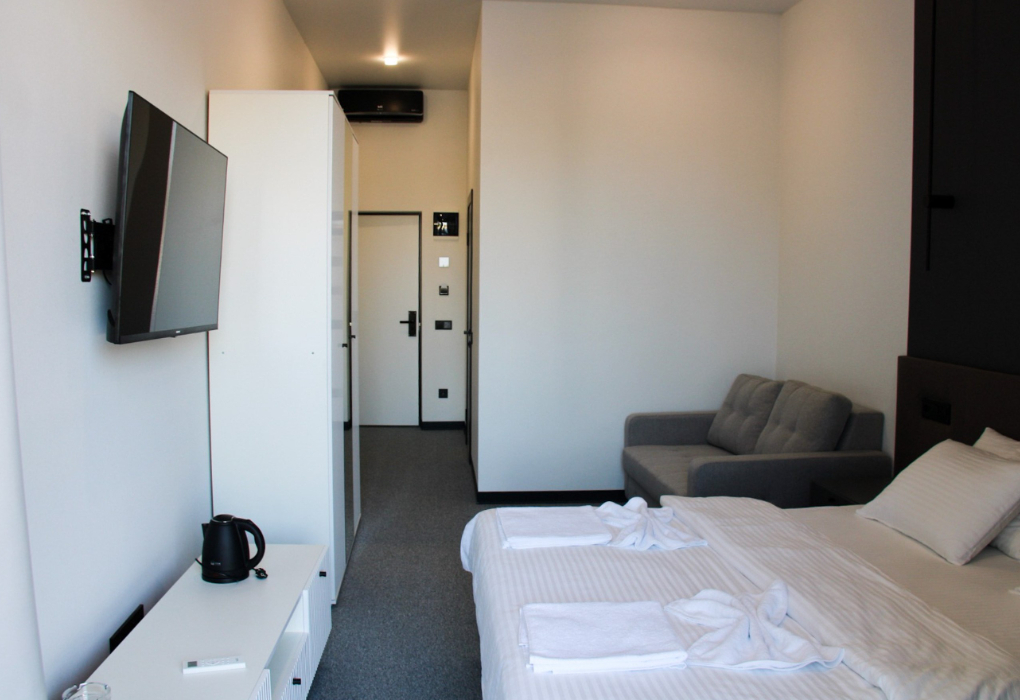 Площадь номера - 35 кв.м. 1 комната. 2 осн. места. средства личной гигиены. В номере: телевизор; сплит-система; душ; фен; халаты; тапочки; туалетные принадлежности; 2-спальная кровать; диван; чайная станция.