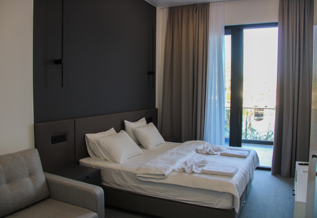 Площадь номера - 30 кв.м. 1 комната. 2 осн. места. средства личной гигиены, 1 номер с раздельными кроватями. В номере: телевизор; сплит-система; душ; фен; халаты; тапочки; туалетные принадлежности; 2-спальная кровать; диван; чайная станция.