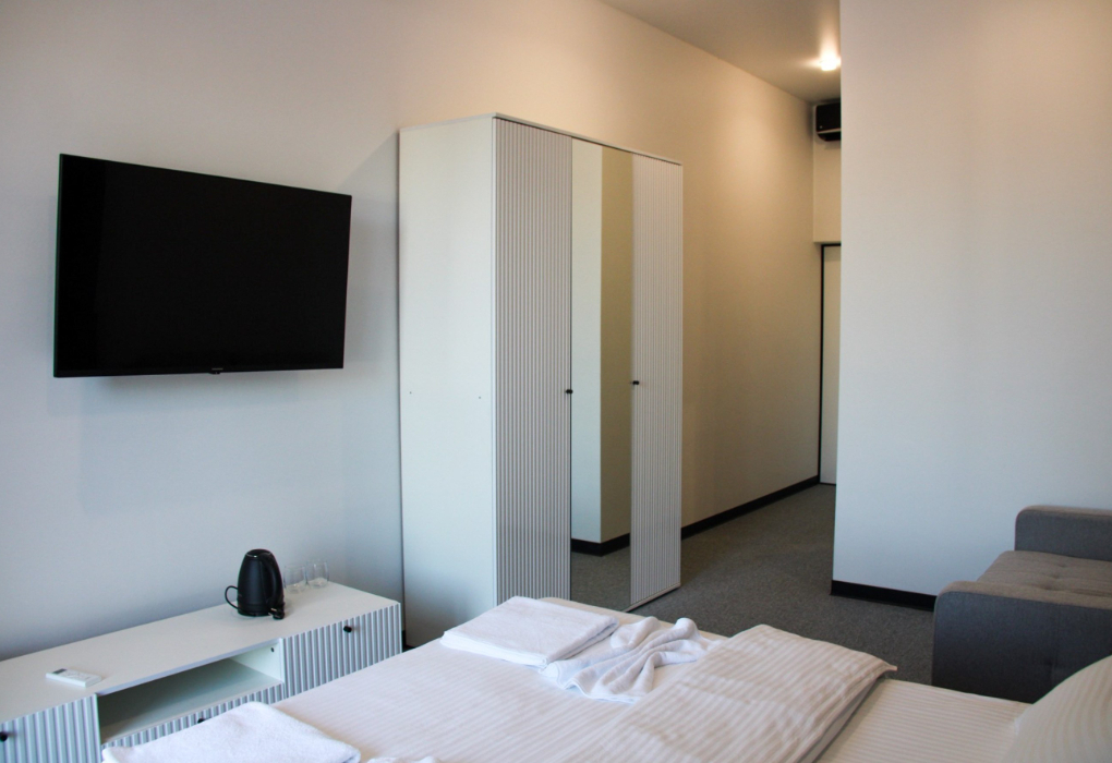 Площадь номера - 40 кв.м. 1 комната. 2 осн. места. средства личной гигиены. В номере: телевизор; сплит-система; душ; фен; халаты; тапочки; туалетные принадлежности; 2-спальная кровать; диван; чайная станция. 2 доп. места: Раскладной 2-спальный диван - может быть установлен без ограничения по возрасту (включено в стоимость номера).